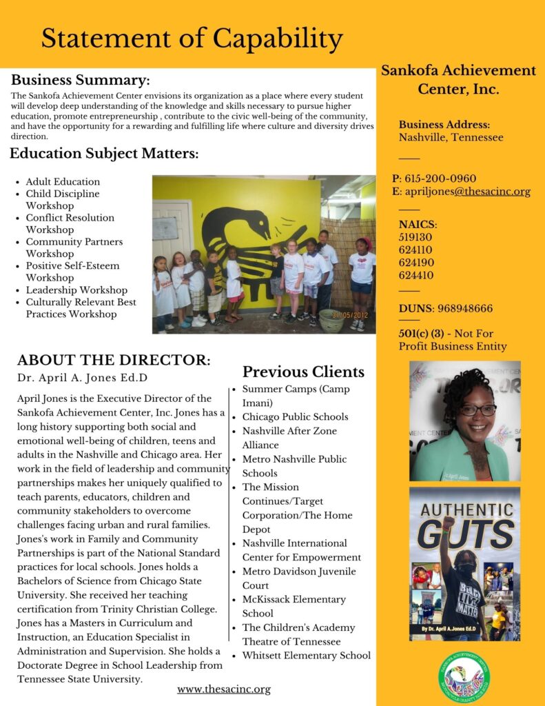 Impact Statement: See How We Put Your Donations To Work. Since 2012 The Sankofa Achievement Center, Inc. has assisted and transitioned 65 K-12 students to graduate from high school. Provided 150 scholarships for students to attend summer camp and after school programming. Today, we are still thriving as a full primary school center in Davidson County, serving more than 50 at-risk youth a year with a variety of programs and services. Since our inception, we have proudly served more than 600 youth in Davidson County. To date we have accumulated over 1,700 hours of volunteer service.