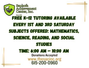 Free Tutoring every 1st and 3rd Saturday of the month. Donations are welcomed at the door. Come one, come all and get the help you need to be the best version of you!